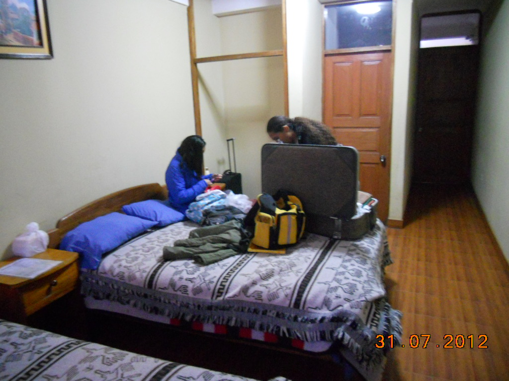 We put our backpacks on the two double beds and turned on the TV bracketed to the wall, then plugged in our hervidor to boil some water to make mate de coca tea to ward off altitude sickness. We made sure that the water heater that was attached directly to the shower head actually worked so we could have hot showers, then we unfolded the four, half-inch-thick llama wool blankets to assure our warmth for the night, regardless of the lack of a heater. We had chosen late July, the middle of winter, but also the dry season. (The summer rains make Machu Picchu a bit slippery… to the point it sometimes closes.) We donned our chullos to keep our heads warm, another remedy for altitude sickness, then set off to find supper. The hostal’s daughter told us there were a McDonald’s and a Burger King in the plaza de armas, an eleven minute walk. Jessica asked if there was a market nearby. It was two blocks away.