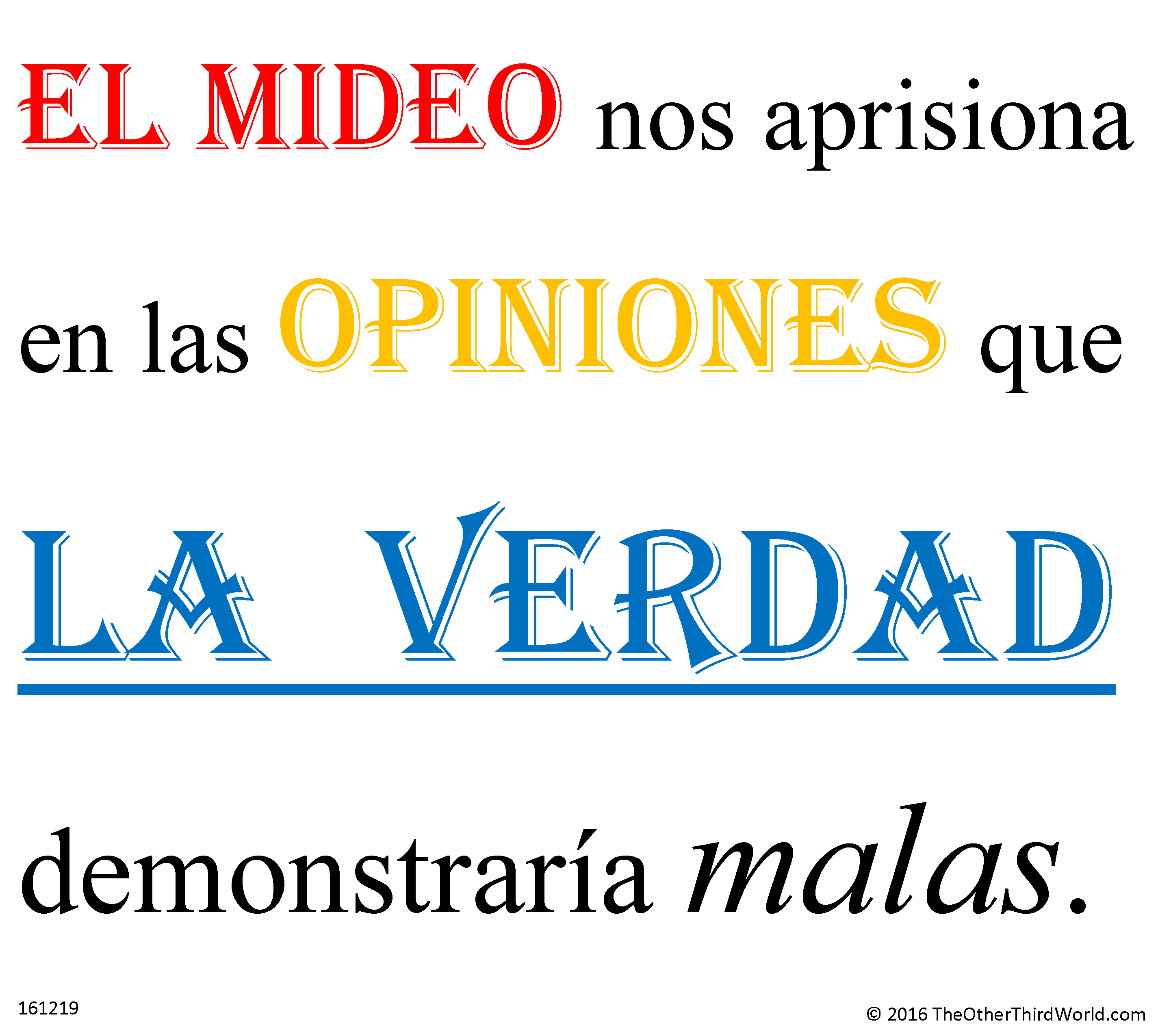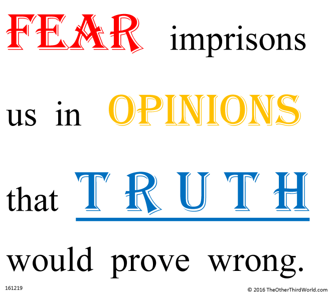 19 Dec, 2016 by TheOtherThirdWorld Fear Imprisons Us Fear imprisons us in opinions that Truth would prove wrong. © Copyright 2016 TheOtherThirdWorld Share this: Click to share on X (Opens in new window) X Click to share on Facebook (Opens in new window) Facebook Like Loading...